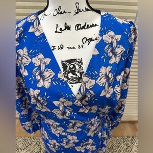 Blue and white wrap dress with a floral pattern.