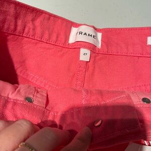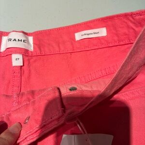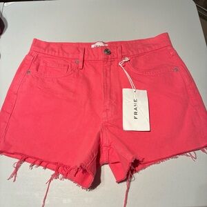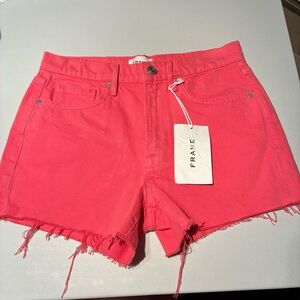 NEW WITH TAGS Frame Le Brigette Denim Shorts. Colour is hot pink, perfect for summer! Zip fly. Pockets in front and back. Raw frayed hem. Would say they run a bit big. Excellent new with tags condition. Size 27.