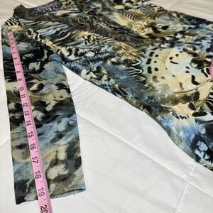 The ALBERTO MAKALI Blue Green Floral Print Beaded Lace Up V-Neck blouse in size L features a tropical-themed design with a relaxed fit. Made of polyester and spandex, this top has a sheer sleeve and a lace-up closure for a stylish and casual look. Perfect for summer, fall, and spring, this blouse is hand wash only and adds a touch of charm with its multicolor floral pattern and beaded accents. Alberto Makali is known for its unique and eye-catching designs, making this blouse a versatile and fashionable addition to any woman's wardrobe.