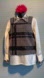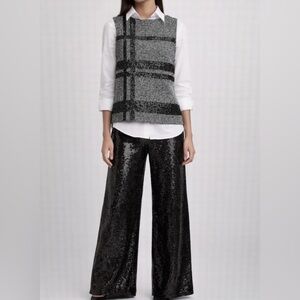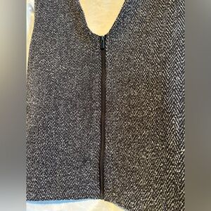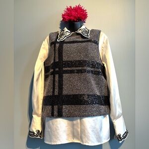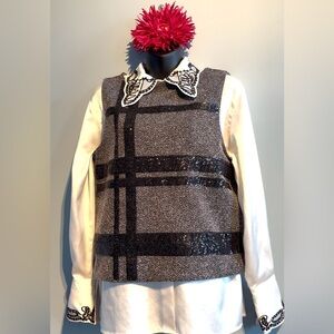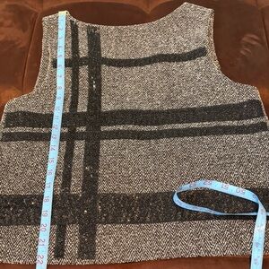 Elegant textured top in black and gray with plaid-pattern sequins. V-back with exposed back zip. Can be worn on its own or over a blouse.