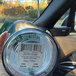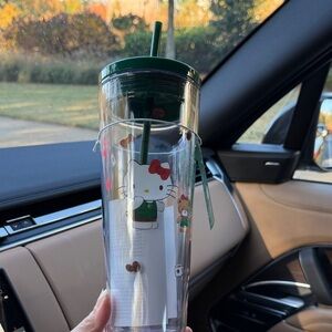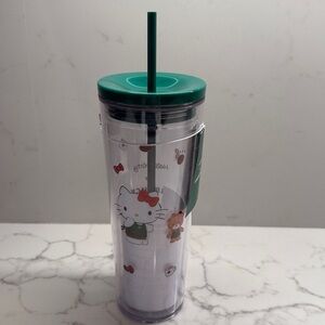 Clear tumbler with Hello Kitty design. Green lid and straw. Hello Kitty and Bear barista.