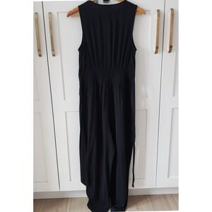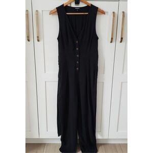 Sleek black Express jumpsuit featuring a sleeveless silhouette, button-front detail, wide leg fit, and removable waist belt for a polished, effortless look.