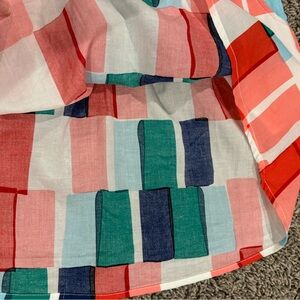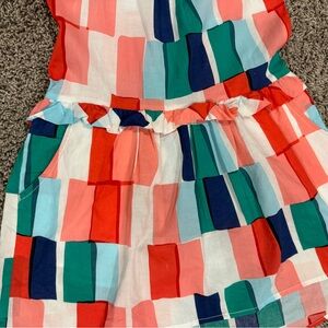 Red, navy blue, coral, sky blue, green, and white color block girls summer dress with blue straps, smocking at the front, asymmetrical hem, unlined in EUC. Size 6