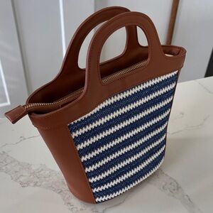 Ann Taylor Blue & White Crochet Stripe and Tan Leather Tote Bag Purse