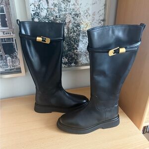 NWT Reiss Black Briony Leather Knee Boots with Gold Buckle