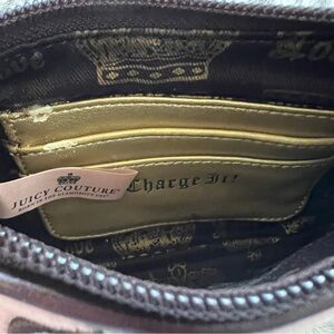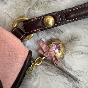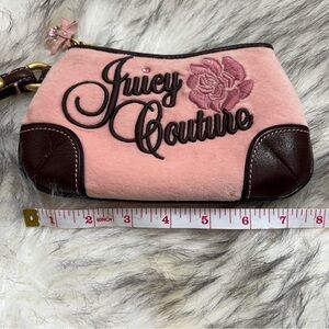 Step out in style with this chic wristlet with Juicy Couture embroidery. The vintage Y2K bag features pink body and brown accents. The gold flower charm adds a feminine touch to the outfit.
