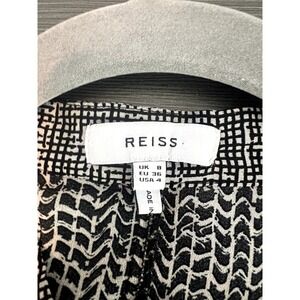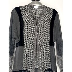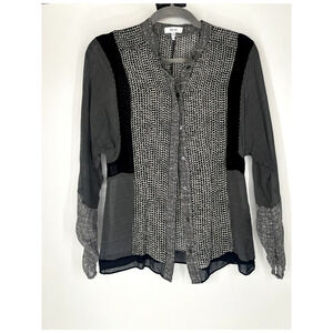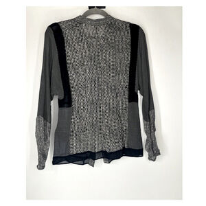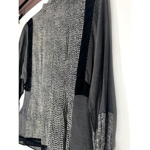 Elegant black and white blouse. Features intricate patterns. Long sleeves with buttoned cuffs. Perfect for formal occasions.