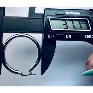 The hoops measure approximately 31.1 mm in diameter with a thickness of 3.8 mm, giving them a substantial yet elegant presence. The total combined weight is 4.6 grams, making them lightweight enough for all-day wear while still feeling solid and well made.