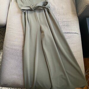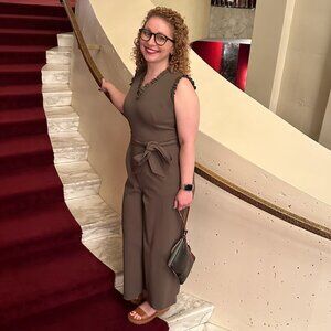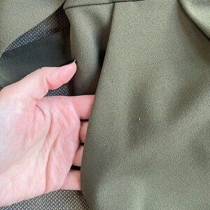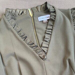 Calvin Klein Women's Sleeveless Ruffle-Trim Cropped Jumpsuit in Size 6. Army green high rise cropped belted jumpsuit, relaxed fit through hips and thighs. V-neck; exposed back gold zipper closure. Ruffle trim at neckline and armholes; self-tie sash belt. Pockets at the hip. Unlined polyester, spandex. Approx. inseam: 24-3/4" and pit to pit flat is approx. 17.5." A Few small snags in the fabric above the center of the belt and by the right pocket as pictured but bot noticeable the further you are from the garment. I am 5" and the photos are of me wearing the jumpsuit for reference.