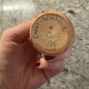 2 sets of handcrafted wooden nesting dolls featuring intricate cream and gold designs.