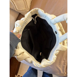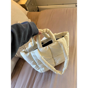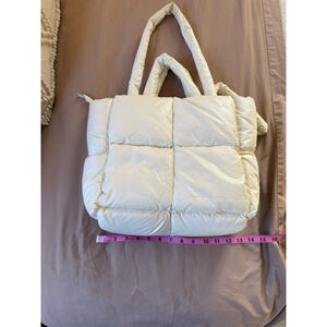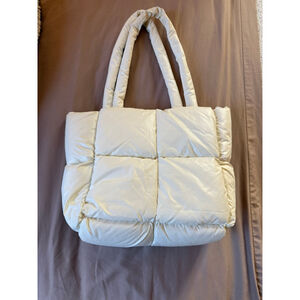 This is a pre-owned, unbranded cream puffer tote bag, featuring a quilted design with large, rectangular padded sections. The bag has two padded top handles and a top zipper closure. The interior is lined with black fabric and includes a zippered pocket and two slip pockets. Visible signs of wear are minimal. The bag measures approximately 15 inches in width and 10 inches in height.