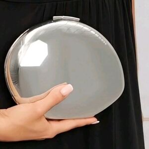 Designer style unbranded acrylic metallic silver ovalshaped clutch crossbody bag.