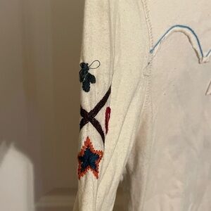 Cream long-sleeve top. Features vibrant floral and animal embroidery. Unique and stylish design. Please note there are stains in the pictures and loose thread. This is the reason for the huge price decrease.