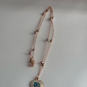 This elegant necklace features a captivating evil eye pendant, perfect for adding a touch of mystique to any outfit. The rose gold chain beautifully complements the turquoise and white accents of the pendant. Ideal for everyday wear or special occasions.