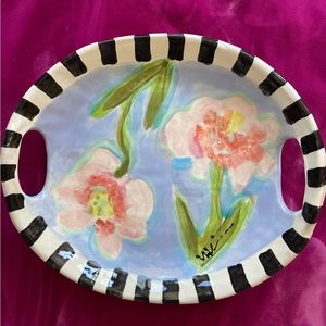 Handmade Ceramic Pink Flowers Design Tray with Handles 11”x9.5” Original design