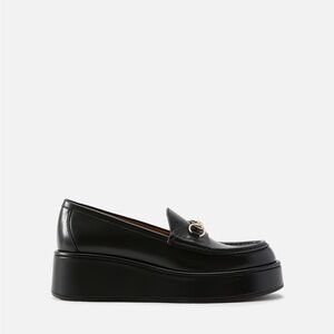 Chic black leather loafers with platform sole. Features signature Gucci hardware. Ideal for stylish comfort.
