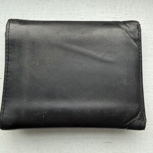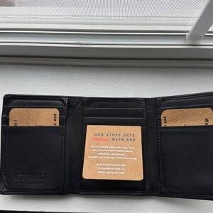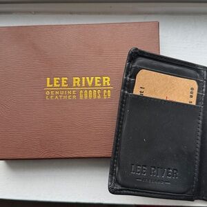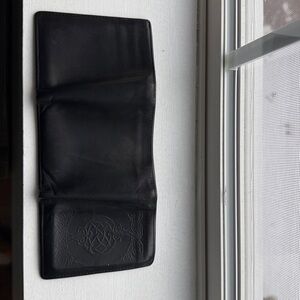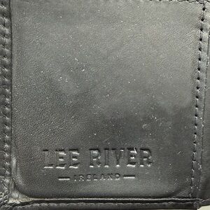 Lee River Ireland hand tooled trifold wallet in black leather, crafted in Cork City Ireland. Slow tanned using an organic blend of natural oils and tannins extracted from trees, resulting in a leather product which ages naturally, and gains character with age. Leather shows normal signs of wear but no tearing, see photos for detail. Ships in original box and in good used condition from a clean and smoke free home.