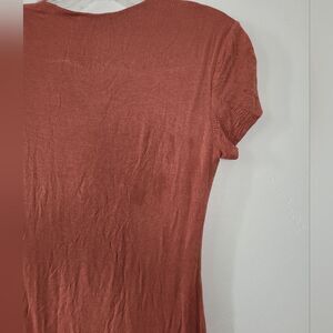 Cute comfy tee shirt dress, perfect for lounging or errands or any casual occasion. Trendy creamy orange copper color. Super soft stretchy material. It is double lined for a Seamless look. There is an area of discoloration on the back, see photos. Size medium, measures approximately 42 inches long 16 inches underarm to underarm laid flat 28 inch waist.