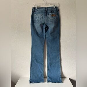 Stylish boot cut jeans by Wrangler. Light blue wash. Comfortable fit for everyday wear.