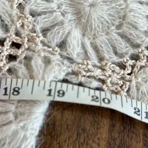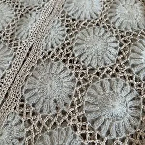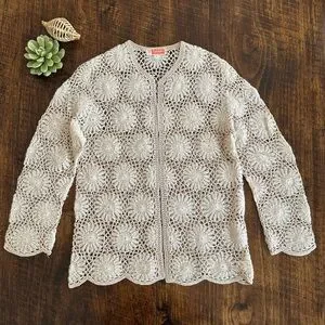 Like new condition. Vintage hand crocheted open front cardigan. Pinkish beige with cream. Beautiful sweater! No size marked. I’m listing as a size small, but please see measurements for accurate fit.