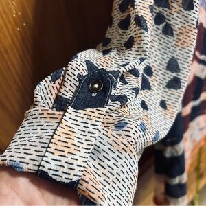 Beautifully patterned blouse featuring waves of blue, coral, and cream with unique gold embellishments down the front. The convertible roll-tab sleeves give you the option of wearing it long or rolled up for a relaxed look. Lightweight and versatile—perfect for work, travel, or casual outings.