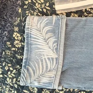 Chic cropped jeans by Belle. Light blue color with a patterned cuff. Ideal for everyday style. From a smoke free home. Inseam is 22”