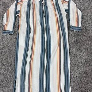 Stylish long sleeve dress with vertical stripes. Features a mix of blue, cream, and tan colors.