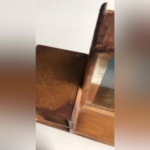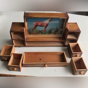 This Tiny Vanity Trinket Jewelry Box With 3D Horse Post Card Size Frame Made in Japan is so cute. It has 5 tiny drawers and decor inside shadow box style frame. There is finish missing on piece see pics where it has been painted over. Measures 10” wide x 5” tall x 2.25” deep.