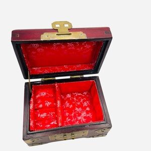Wood Jewelry Box with redwood finish and brass/metal accents. It has padded red fabric Interior with 2 types of storage areas. This jewelry box measures approximately 5-inches by 3 1/2- inches and 3-inches tall.