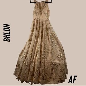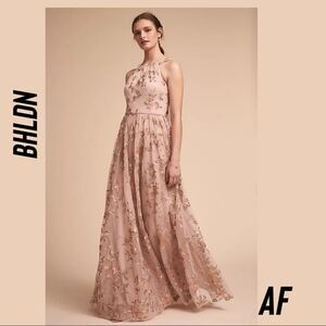 Part of a special collection from BHLDN. For the full assortment, visit BHLDN.com. This ethereal A-line dress is cut from tulle and embroidered head-to-toe with delicate gold florals. A cutaway halter neck and back bow finish the look.