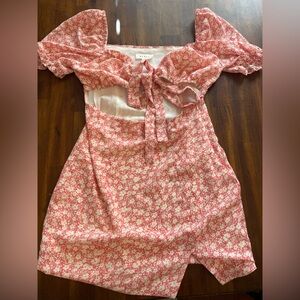 Mable floral mini dressing floral print with a tie front. Has built in liner and features elastics in the straps to keep in place. Mable size medium, good preowned condition.
