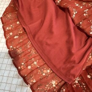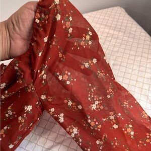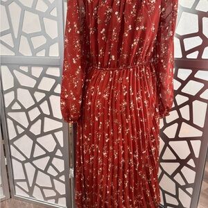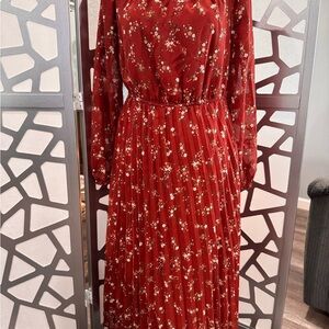 This elegant long sleeve dress features a rich red color with a charming floral design. Ideal for any special occasion.