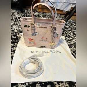 Stylish and chic, this Michael Kors bag features a playful pink pattern. Perfect for adding a touch of elegance to any outfit. Cute spring purse with removable/adjustable strap. Clean ran interior with inside tags. Dust bag included.