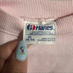 Great vintage condition sweater. Pink with gray and white quilt patch and print appliqués. Size XL