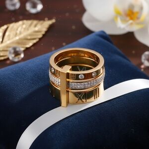 Make a bold statement with this luxe Roman numeral ring! Crafted in durable stainless steel and finished with radiant 18K gold plating, it blends timeless design with a modern stacked look. Sparkling cubic zirconia accents add brilliance and sophistication, while the smooth interior and secure fixed design keep it comfy all day. Unisex and versatile, it pairs with casual tees, office looks, and night-out outfitsโperfect for gifting or treating yourself. Designed for durability, this hypoallergenic piece resists tarnish and keeps its shine, making it a long-lasting addition to your jewelry collection.