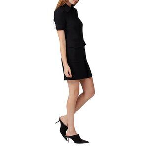 Black crepe (100% Polyester). Hourglass. Short sleeves. Shirt collar neckline. Hidden front button closure.