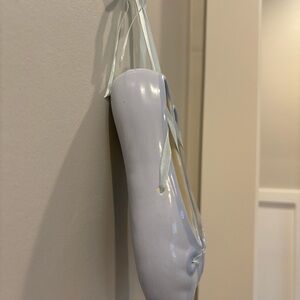 Enhance your home with this elegant ceramic ballet shoe wall art. The soft blue color adds a calming and sophisticated touch to any decor.