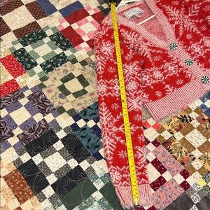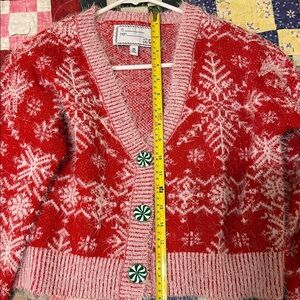 Embrace the holiday spirit with this cozy red and white snowflake cardigan. Perfect for adding warmth and style to your winter outfits.