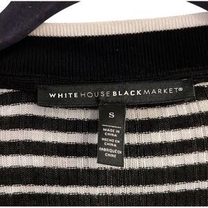 Keywords: White House Black Market, cardigan, black sweater, women's fashion, casual wear, striped knit, long sleeve, rayon blend, cozy cardigan, pre-owned sweater, elegant style, regular fit, machine wash, women's cardigan, casual occasions.