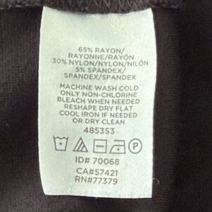 Chic black dress with 3/4 sleeves. Draped front design. Perfect for versatile styling.