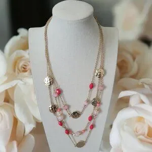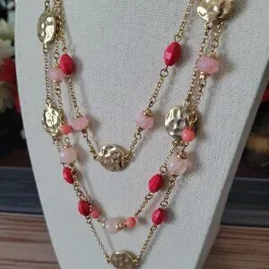 Gold Tone Multi Strand Necklace Pink Red Beads Hammered Discs Layered