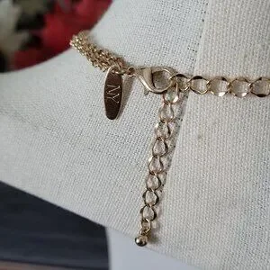 This elegant layered necklace features a warm gold-tone finish with three delicate strands that drape beautifully for an effortless, styled look.