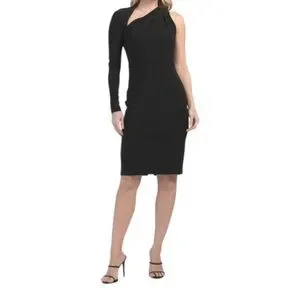 This sleek Betsy & Adam black dress features a modern one-shoulder silhouette with a single long sleeve, offering a chic, sophisticated look ideal for cocktail parties, formal events, evening receptions, and date nights. Designed in a flattering sheath/bodycon fit, this dress contours the figure beautifully while maintaining a polished, elegant feel.