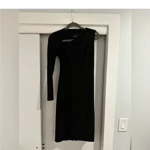 One shoulder dress, asymmetrical neckline, long sleeve dress, black sheath dress, fitted bodycon dress, jersey cocktail dress, formal evening wear, modern minimalist dress, elegant occasion dress, holiday party dress, classic black dress.