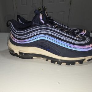 Nike Air Max 97 sneakers with a multicolor design. Features blue, black, and cream tones.