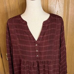 This top is made by Wrangler. It’s a burgundy brown plaid babydoll style with 3/4 length sleeves. Size XL and in wonderful pre owned condition. Smoke and pet free home.