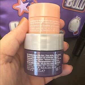Clinique concealer set includes a vibrant purple bag. Features cleansing balm and mascara. Ideal for travel.
