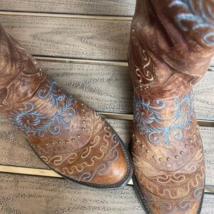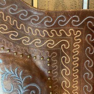 Stylish brown leather boots with intricate blue embroidery. Perfect for a bold look.