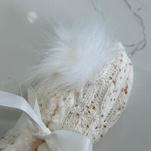 Ann Taylor Factory Cozy Ivory & Gold Slippers with White Pom-Pom Size M/L