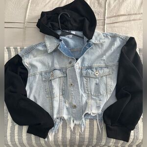 Cropped denim jacket with black cotton sleeves. Features a frayed hem and distressed details. Includes a hood for added style. So cool and trendy. Size large. Only worn once. Purchased at an online boutique.